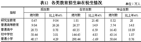科技事業(yè)進一步發(fā)展。認定國家級企業(yè)(集團)技術(shù)中心5家,比上年增加3家。全年共取得省部級以上科技成果704項,比上年增加70項,其中:應(yīng)用技術(shù)成果651項,軟科學成果53項。全年獲得獎勵177項。受理專利申請1460件,授權(quán)專利832件。技術(shù)交易穩(wěn)步發(fā)展,全年共簽訂技術(shù)合同1995項,比上年增長6.29%;技術(shù)合同成交金額21.45億元,增長24.20%。 教育事業(yè)穩(wěn)步推進。全省普通高等教育招生9.04萬人,比上年增長26.26%,在校學生26.37萬人,增長14.90%;研究生教育招生0.67萬人,增長9.84%,在學研究生1.81萬人,增長21.48%;普通高中招生20.73萬人,增長0.78%;初中學校招生50.44萬人,增長3.81%;普通小學招生48.17萬人,增長4.29%;特殊教育招生0.13萬人,在校學生0.91萬人。