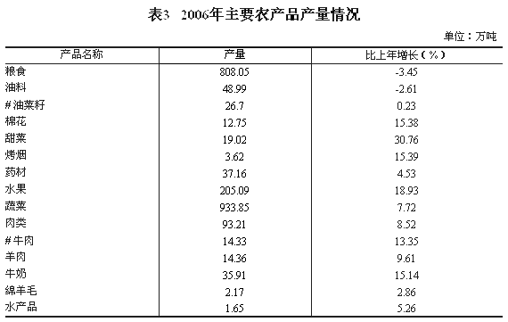 棉花種植面積7.60萬公頃,增長18.87%;油料種植面積32.49萬公頃,下降1.21%;糖料種植面積0.51萬公頃,增長13.94%;蔬菜種植面積31.75萬公頃,增長3.47%。主要經(jīng)濟作物中,棉花、藥材、烤煙和甜菜增產(chǎn),油料減產(chǎn)。