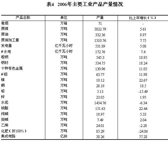 規(guī)模以上工業(yè)中,集體企業(yè)完成32.21億元,增長17.34%;外商及港澳臺企業(yè)完成21.65億元,增長18.21%;股份制企業(yè)完成432.87億元,增長16.72%。輕工業(yè)完成增加值114.59億元,增長9.54%;重工業(yè)完成增加值659.62億元,增長18.92%。 主要產(chǎn)品產(chǎn)量平穩(wěn)增長。全年發(fā)電量531.89億千瓦小時,比上年增長5.08%;原煤3822.79萬噸,增長5.61%;原油332.36萬噸,增長8.97%;原油加工量1310.76萬噸,增長7.75%。粗鋼產(chǎn)量545.30萬噸,增長18.95%;鋼材534.75萬噸,增長18.24%;水泥1454.76萬噸,下降6.34%;十種有色金屬130.96萬噸,增長11.05%。