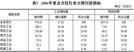 經(jīng)濟運行質(zhì)量提高。全年規(guī)模以上工業(yè)企業(yè)盈虧相抵后,實現(xiàn)利潤總額107.35億元,比上年增長62.69%,其中國有及國有控股企業(yè)實現(xiàn)利潤85.25億元,增長61.40%。規(guī)模以上工業(yè)中,集體企業(yè)實現(xiàn)利潤4.26億元,增長84.97%;股份制企業(yè)實現(xiàn)利潤47.94億元,增長26.58%;外商及港澳臺企業(yè)實現(xiàn)利潤2.33億元,增長51.03倍。規(guī)模以上工業(yè)虧損企業(yè)虧損額73.19億元,比上年增長43.43%,其中國有及國有控股虧損企業(yè)虧損額69.62億元,增長50.12%。 支柱行業(yè)增勢強勁,支撐作用不斷加大。石化、有色、電力、冶金、食品和機械等支柱產(chǎn)業(yè)完成工業(yè)增加值占規(guī)模以上工業(yè)的88.01%,其中:石化工業(yè)完成增加值208.10億元,比上年增長10.24%;有色工業(yè)完成增加值178.69億元,增長26.28%;電力工業(yè)完成增加值95.52億元,增長11.78%;冶金工業(yè)完成增加值75.80億元,增長45.04%。