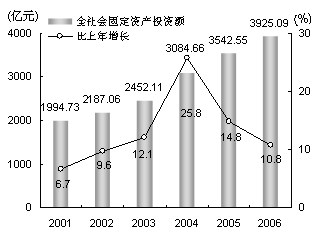 增長19.5%;營業(yè)稅558.67億元,增長8.9%;個人所得稅131.07億元,增長17.1%;房產(chǎn)稅42.68億元,增長25.1%。全年地方財政支出1813.8億元,比上年增長9.2%。其中,基本建設(shè)支出395.58億元,增長7.1%;科教文衛(wèi)事業(yè)支出316.12億元,增長13.9%;企業(yè)挖潛改造資金支出251.99億元,增長5.9%。 固定資產(chǎn)投資增幅回落。全年完成全社會固定資產(chǎn)投資總額3925.09億元,比上年增長10.8%,增幅比上年回落4個百分點(見圖2)。其中建設(shè)改造投資2246.93億元,增長13.2%。投資結(jié)構(gòu)進(jìn)一步優(yōu)化。從產(chǎn)業(yè)投向看,第一產(chǎn)業(yè)投資14.29億元,比上年增長1.6倍,占全社會固定資產(chǎn)投資總額的比重為0.4%;第二產(chǎn)業(yè)投資1212.71億元,增長12.1%,所占比重為30.9%;第三產(chǎn)業(yè)投資2698.09億元,增長9.9%,所占比重為68.7%。從投資主體看,國有經(jīng)濟投資1460.09億元,比上年增長17.7%,占全社會固定資產(chǎn)投資總額的比重為37.2%;集體經(jīng)濟投資159.31億元,增長21.6%,所占比重為4.1%;股份制經(jīng)濟投資910.31億元,下降0.7%,所占比重為23.2%;外商及港澳臺投資725.85億元,增長13.4%,所占比重為18.5%。