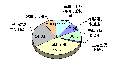 區(qū)縣工業(yè)持續(xù)增長。全市區(qū)縣規(guī)模以上工業(yè)總產(chǎn)值11140.81億元,比上年增長14.7%,占全市規(guī)模以上工業(yè)總產(chǎn)值的比重達(dá)到60.8%。 重點發(fā)展行業(yè)發(fā)展態(tài)勢良好。電子信息產(chǎn)品制造業(yè)、汽車制造業(yè)、石油化工及精細(xì)化工制造業(yè)、精品鋼材制造業(yè)、成套設(shè)備制造業(yè)、生物醫(yī)藥制造業(yè)等六個重點發(fā)展工業(yè)行業(yè)完成工業(yè)總產(chǎn)值11789.46億元,比上年增長17.9%,占全市規(guī)模以上工業(yè)總產(chǎn)值的比重達(dá)到64.4%(見圖4)。