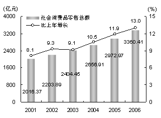 商業(yè)布局與結(jié)構(gòu)調(diào)整步伐加快,市場流通規(guī)模繼續(xù)擴大。全年批發(fā)和零售業(yè)實現(xiàn)增加值919.43億元,比上年增長9.1%。 消費品市場銷售活躍。全年實現(xiàn)社會消費品零售總額3360.41億元,比上年增長13%,增幅創(chuàng)1998年以來最高(見圖5)。其中,吃的商品零售額1328.3億元,增長13.3%;穿的商品零售額425.7億元,增長11.6%;用的商品零售額1566.55億元,增長12.8%。餐飲業(yè)、家居和通訊類商品全面增長。全年餐飲業(yè)實現(xiàn)零售額452.16億元,比上年增長29%;家居類商品實現(xiàn)零售額393.2億元,增長15.3%;通訊類商品實現(xiàn)零售額92億元,增長17.9%。主要耐用消費品銷售穩(wěn)步增長。全年汽車零售量9.6萬輛,比上年增長5.3%,其中轎車8.8萬輛,增長5.7%;移動電話230.29萬部,增長23.5%;攝像機6.55萬臺,增長9.4%;脫排油煙機39.18萬臺,增長12.5%。