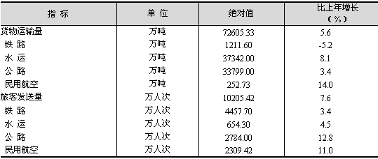 交通運輸、倉儲和郵政業(yè)發(fā)展不斷加快。全年實現(xiàn)交通運輸、倉儲和郵政業(yè)增加值683.61億元,比上年增長13.8%。 客貨運輸全面增長。全年各種運輸方式完成貨物運輸總量72605.33萬噸,比上年增長5.6%。旅客發(fā)送總量10205.42萬人次,增長7.6%(見表4)。