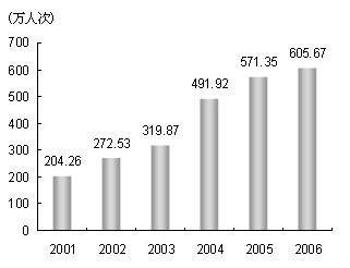旅游環(huán)境不斷優(yōu)化,服務(wù)水平繼續(xù)提高。全年實現(xiàn)旅游產(chǎn)業(yè)增加值695.06億元,比上年增長17.8%。 旅游基礎(chǔ)設(shè)施日趨完善。至年末,全市星級賓館已達(dá)317家,其中五星級賓館26家。全市已有旅行社879家。其中,國際旅行社53家,國內(nèi)旅行社826家。旅游入境人數(shù)穩(wěn)步增長。全年接待國際旅游入境人數(shù)605.67萬人次,比上年增長6%(見圖6)。其中,入境外國人485.4萬人次,增長7.3%;港、澳、臺同胞120.27萬人次,增長1%。在國際旅游入境人數(shù)中,過夜旅游人數(shù)464.63萬人次,比上年增長4.5%。國際旅游外匯收入39.61億美元,比上年增長9.8%。全年接待國內(nèi)旅游者9683.97萬人次,比上年增長7.5%,其中外省市來滬旅游者7326.64萬人次,增長7.7%。國內(nèi)旅游收入1419.94億元,比上年增長8.5%。