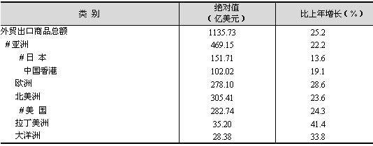 外貿(mào)出口結(jié)構(gòu)進(jìn)一步優(yōu)化。一般貿(mào)易出口增幅繼續(xù)高于加工貿(mào)易。全年一般貿(mào)易完成出口433.04億美元,比上年增長27.7%;加工貿(mào)易出口637.69億美元,增長22.9%。出口產(chǎn)品結(jié)構(gòu)調(diào)整加快,高新技術(shù)產(chǎn)品和機電產(chǎn)品出口快速增長。全年高新技術(shù)產(chǎn)品出口442.81億美元,比上年增長22.1%,占全市外貿(mào)出口總額的比重達(dá)到39%;機電產(chǎn)品出口754.15億美元,增長25.2%,占全市的比重達(dá)到66.4%。出口市場多元化戰(zhàn)略進(jìn)一步鞏固(見表7)。