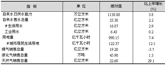 公用事業(yè)綜合服務(wù)水平繼續(xù)提高。全市自來水日供水能力達(dá)到1138萬立方米。全年全市用電量990.15億千瓦小時,比上年增長7.4%。至年末,全市家庭人工煤氣用戶230.02萬戶;家庭液化氣用戶260.5萬戶;家庭天然氣用戶達(dá)到216.9萬戶(見表10)。