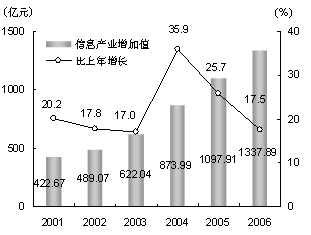 信息產(chǎn)業(yè)繼續(xù)保持平穩(wěn)發(fā)展。全年實現(xiàn)信息產(chǎn)業(yè)增加值1337.89億元,比上年增長17.5%(見圖9)。其中,信息產(chǎn)品制造業(yè)增加值813.43億元,增長17.2%;信息產(chǎn)品銷售業(yè)增加值24.91億元,增長14.9%;信息服務(wù)業(yè)增加值499.55億元,增長18.1%。全市用于信息化建設(shè)的固定資產(chǎn)投資296.25億元,占全社會固定資產(chǎn)投資總額的比重為7.5%。