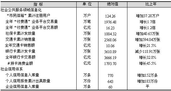 信息技術(shù)應(yīng)用向廣度和深度拓展。政府信息公開內(nèi)容進(jìn)一步深化。全年政府部門主動公開信息4.88萬條,依申請公開信息目錄1.18萬條,收到政府信息公開申請7533件,同意公開和部分公開率達(dá)到79.4%。電子政務(wù)網(wǎng)絡(luò)加快建設(shè)。全年“中國上!遍T戶網(wǎng)站主頁訪問量達(dá)2093.46萬人次,實現(xiàn)網(wǎng)上辦事和服務(wù)1671項。電子口岸平臺功能進(jìn)一步完善,全年電子口岸平臺的企業(yè)電子支付金額達(dá)650億元,比上年增長35.4%。全年完成電子商務(wù)交易額1899.65億元,比上年增長17%。數(shù)字證書累計發(fā)放71.8萬張。信息化發(fā)展環(huán)境日益優(yōu)化。全市累計有406.3萬人次的市民參加了計算機應(yīng)用能力等級考核,其中188萬人次取得合格證書。 信息基礎(chǔ)設(shè)施服務(wù)能力不斷提升。至年末,集約化信息管線累計敷設(shè)2451溝公里,比上年末增加830溝公里;互聯(lián)網(wǎng)用戶達(dá)到957萬戶,增加154萬戶;寬帶接入用戶335.2萬戶,增加87.8萬戶;有線電視用戶達(dá)到448.12萬戶,增加20.82萬戶,其中有線電視雙向改造完成200.3萬戶,增加14.64萬戶;衛(wèi)星站點831個,比上年末減少84個。 社會公共服務(wù)領(lǐng)域信息化程度進(jìn)一步提高,社會信用體系不斷完善(見表11)。