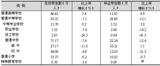 加快高校學(xué)科布局和專業(yè)結(jié)構(gòu)調(diào)整,深化教育綜合改革。至年末,全市共有普通高等學(xué)校60所;普通中等學(xué)校945所;普通小學(xué)626所;特殊教育學(xué)校28所。普通高校在校生和畢業(yè)生數(shù)持續(xù)擴大,中等學(xué)校和小學(xué)生在校生和畢業(yè)生數(shù)繼續(xù)下降(見表12)。全市義務(wù)教育階段公辦學(xué)校學(xué)雜費全部免除,受益學(xué)生達(dá)到85.1萬人。享受高校幫困獎學(xué)金的大學(xué)生4.59萬人;實施中等職業(yè)教育幫困助學(xué)和專業(yè)獎勵辦法,減免和獎勵2.5萬余名中職學(xué)生的學(xué)費。