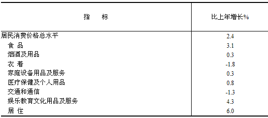 城市居民消費價格總水平比上年上漲2.4%,其中居住、娛樂教育文化用品及服務(wù)、食品價格上漲較快,分別上漲了6.0%、4.3%和3.1%;商品零售價格上漲1.6%。工業(yè)品出廠價格上漲2.2%,原材料、燃料、動力購進價格上漲4.8%。