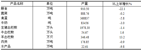 全年糧食種植面積2488.80萬畝,比上年減少0.5%;油料種植面積257.29萬畝,增長1.93%;蔬菜種植面積417.41萬畝,增長4.4%。 全年完成農(nóng)林牧漁業(yè)總產(chǎn)值637.24億元,比上年減少3.2%,其中種植業(yè)340.95億元,減少5.1%;畜牧業(yè)240.31億元,減少0.4%。 全年糧食總產(chǎn)量910.50萬噸,比上年減產(chǎn)22.1%;蔬菜產(chǎn)量888.76萬噸,下降0.2%;禽蛋產(chǎn)量36.88萬噸,下降5.8%;牛奶產(chǎn)量8.35萬噸,下降3.0%。肉類總產(chǎn)量176.85萬噸,下降0.9%;水產(chǎn)品產(chǎn)量22.61萬噸,下降9.8%。