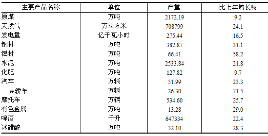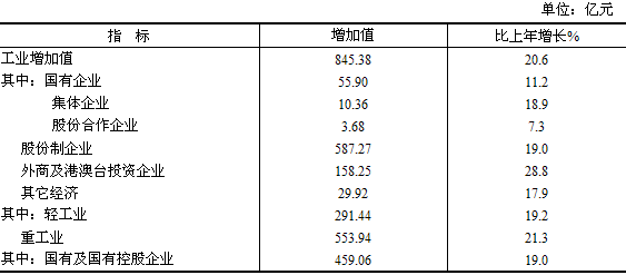 全部工業(yè)實現(xiàn)增加值1234.12億元,比上年增長18.0%。規(guī)模以上工業(yè)實現(xiàn)增加值845.38億元,增長20.6%。產(chǎn)品銷售率為98.4%,比上年下降0.3個百分點。