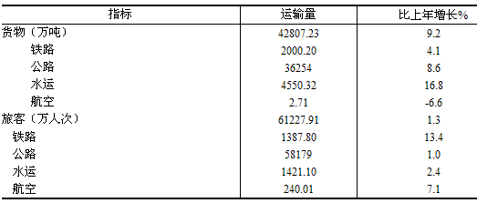 全市新增公路通車?yán)锍?081公里,累計達到100299公里,其中高速公路778公里,一、二級公路6309公里。全市鄉(xiāng)鎮(zhèn)客車通達率為97.3%。全年各種運輸方式完成貨物運輸周轉(zhuǎn)量821.38億噸公里,比上年增長31.4%;完成旅客運輸周轉(zhuǎn)量301.58億人公里,下降0.1%。 內(nèi)河港口完成貨物吞吐量3573.53萬噸,比上年增長6.5%;集裝箱吞吐量52.6萬標(biāo)箱,增長39.5%。空港旅客吞吐量805.00萬人,增長32.9%;空港貨物吞吐量11.65萬噸,增長15.5%。 年末全市民用車輛擁有量達到131.93萬輛,比上年增長19.2%。其中私人汽車31.80萬輛,增長17.6%;民用轎車擁有量達到18.26萬輛,其中私人轎車12.33萬輛。