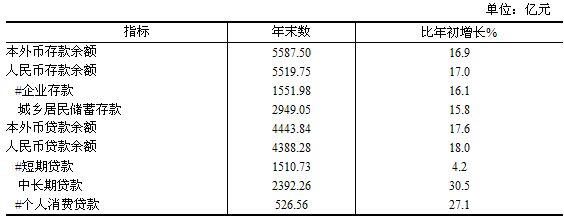年末全市金融機構(gòu)本外幣存款余額5587.50億元,比年初增長16.9%。城鄉(xiāng)居民儲蓄存款余額2949.05億元,增長15.8%。本外幣貸款余額4443.84億元,增長17.6%,其中個人消費貸款余額526.56億元,增長27.1%。