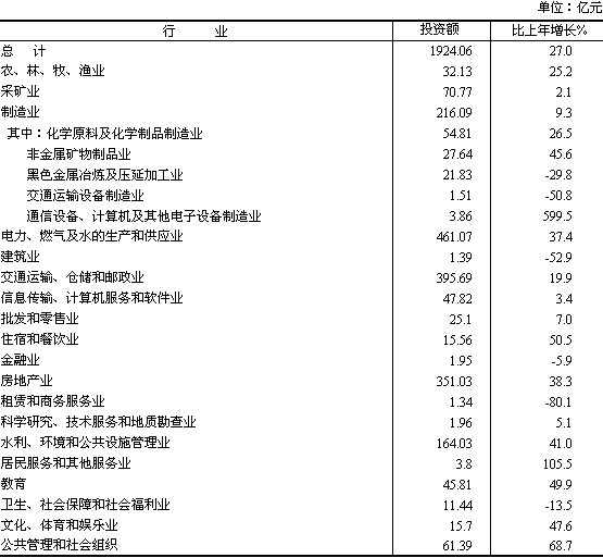 在城鎮(zhèn)固定資產(chǎn)投資中,國有及國有控股單位投資1306.87億元,比上年增長25.4%。第一產(chǎn)業(yè)投資32.13億元,增長25.2%;第二產(chǎn)業(yè)投資749.32億元,增長23.7%;第三產(chǎn)業(yè)投資1142.61億元,增長29.3%。 重點行業(yè)和重大項目投資帶動作用明顯。全省電力工業(yè)投資446.09億元,增長38.3%;公路建設(shè)投資345.67億元,增長17.7%,水利環(huán)境和公共設(shè)施管理164.03億元,增長41.0%。