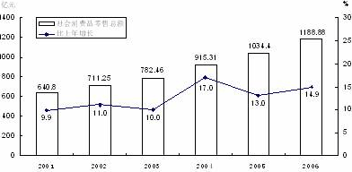 2001-2006年社會消費(fèi)品零售總額及其增長速度