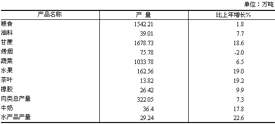 ,比上年增長1.8%,實現(xiàn)了從2003年以來連續(xù)4年增產(chǎn)的可喜成就。油料產(chǎn)量39.01萬噸,增長7.7%;烤煙產(chǎn)量75.78萬噸,下降2.0%;蔬菜產(chǎn)量1033.78萬噸,增長6.5%;水果產(chǎn)量162.56萬噸,增長19.0%;茶葉產(chǎn)量13.82萬噸,增長19.2%;鮮切花產(chǎn)量39.9億枝,增長8.1%。