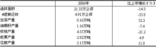林業(yè)生產(chǎn)實(shí)現(xiàn)生態(tài)建設(shè)和經(jīng)濟(jì)效益協(xié)調(diào)發(fā)展。2006年,全省林業(yè)生產(chǎn)從過去的以退耕還林、增加造林面積、封山綠化為主,向提高林木質(zhì)量、保護(hù)森林資源、改善生態(tài)環(huán)境、增加林業(yè)產(chǎn)品產(chǎn)出方向轉(zhuǎn)變。主要林產(chǎn)品產(chǎn)量穩(wěn)定增長。