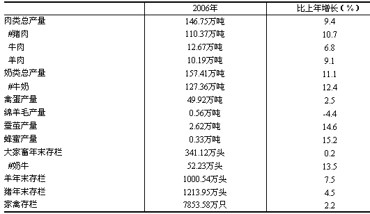 畜牧業(yè)生產(chǎn)穩(wěn)定發(fā)展,產(chǎn)業(yè)化步伐加快。2006年,我省繼續(xù)堅(jiān)持把畜牧業(yè)作為農(nóng)業(yè)結(jié)構(gòu)調(diào)整的主導(dǎo)產(chǎn)業(yè),以市場為導(dǎo)向,以產(chǎn)業(yè)化發(fā)展為目標(biāo),以奶業(yè)發(fā)展為突破口,狠抓疫病防治、健全良種建設(shè)、推廣標(biāo)準(zhǔn)化飼養(yǎng)、大力實(shí)施科技興牧戰(zhàn)略,促進(jìn)了畜牧業(yè)生產(chǎn)方式的轉(zhuǎn)變和畜產(chǎn)品生產(chǎn)能力的提高。