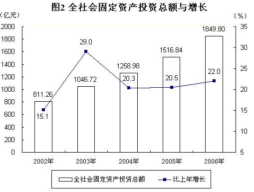 城市商品零售價(jià)格指數(shù)為100.4。工業(yè)品出廠價(jià)格指數(shù)為100.6。原材料燃料及動(dòng)力購(gòu)進(jìn)價(jià)格指數(shù)為104.7。房屋銷(xiāo)售價(jià)格指數(shù)為106.7,其中商品住宅價(jià)格指數(shù)為107.1。 固定資產(chǎn)投資 全社會(huì)固定資產(chǎn)投資完成1849.80億元,比上年增長(zhǎng)22.0%(見(jiàn)圖2)。其中,城鎮(zhèn)固定資產(chǎn)投資1709.66億元,增長(zhǎng)23.4%;農(nóng)村固定資產(chǎn)投資140.14億元,增長(zhǎng)6.9%。