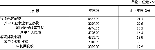 財政收入繼續(xù)強勢增長。全年全省完成財政總收入1048.0億元,一般預算收入583.1億元,分別比上年增長38.2%和58.3%?鄢Y源探礦權、采礦權收入,財政總收入和一般預算收入分別為887.3億元和422.4億元,同口徑增長20.3%和21.4%。增值稅、營業(yè)稅、資源稅、企業(yè)所得稅和個人所得稅五大稅種共計完成稅收281.8億元,分別增長15.7%、22.7%、12.3%、41.7%和14.8%,增收49.6億元,占到財政總收入增量的33.2%。 財政支出結構進一步優(yōu)化。一般預算支出執(zhí)行912.0億元,比上年增長36.4%。其中基本建設支出增長7.9%,水利和氣象支出增長17.3%,科學支出增長18.0%,教育支出增長17.7%,醫(yī)療衛(wèi)生支出增長25.0%,撫恤和社會福利救濟費支出增長22.7%,城市居民最低生活保障支出增長17.8%,公檢法司支出增長23.4%,文體廣播事業(yè)費增長21.7%。 年末全省金融機構本外幣各項存款余額8656.0億元,比年初增加1529.3億元,與上年相比,多增338.4億元,增長21.5%,增幅同比提高1.5個百分點。各項貸款余額4878.7億元,比年初增加564.3億元,比上年多增297.6億元,增長13.0%,增幅同比提高2.6個百分點。人民幣個人消費貸款171.2億元,下降27.9%,其中個人住房貸款106.7億元,下降28.4%。全年累計現(xiàn)金收入17964.3億元,累計現(xiàn)金支出18087.6億元,貨幣凈投放123.3億元,比上年多投放91.4億元。
