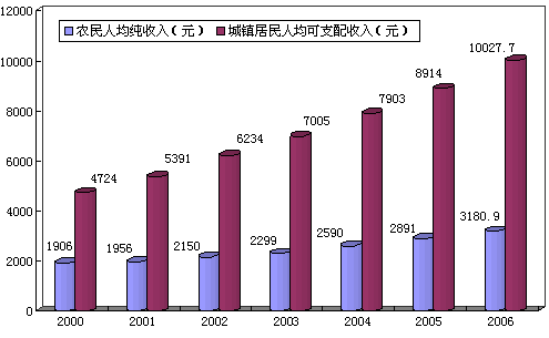 城鄉(xiāng)居民收入較快增長。全年城鎮(zhèn)居民人均可支配收入突破萬元大關,達到10027.7元,比上年增長12.5%,扣除價格上漲因素,實際增長10.5%;城鎮(zhèn)居民人均消費性支出7170.9元,增長13.1%。農(nóng)村居民人均純收入邁上3000元臺階,達到3180.9元,增長10.0%,實際增長7.6%;農(nóng)民人均生活消費支出2253.3元,增長20.0%。城市居民家庭恩格爾系數(shù)(即居民家庭食品消費支出占家庭消費支出的比重)31.4%,農(nóng)村居民家庭恩格爾系數(shù)38.5%。城鎮(zhèn)占人口20%的低收入者收入4213.4元,增長12.9%;農(nóng)村占人口20%的低收入者收入1194.4元,增長10.1%。