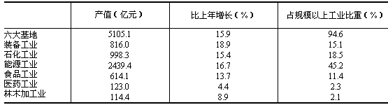 工業(yè)生產(chǎn)與效益同步較快增長(zhǎng)。全年規(guī)模以上工業(yè)企業(yè)(全部國(guó)有及年產(chǎn)品銷售收入500萬元以上的非國(guó)有工業(yè)企業(yè))實(shí)現(xiàn)增加值2554.5億元,比上年增長(zhǎng)15.2%,連續(xù)三年保持15%以上的增速。其中,國(guó)有及國(guó)有控股企業(yè)增加值2199.8億元,增長(zhǎng)15.0%;集體企業(yè)增加值27.5億元,增長(zhǎng)18.5%;股份制企業(yè)增加值2184.1億元,增長(zhǎng)15.1%。從輕重工業(yè)看,輕工業(yè)增加值298.1億元,增長(zhǎng)16.0%;重工業(yè)增加值2256.4億元,增長(zhǎng)15.1%。從企業(yè)規(guī)?矗笾行推髽I(yè)增加值2300.9億元,增長(zhǎng)15.1%;小型企業(yè)增加值253.6億元,增長(zhǎng)16.4%。 全年規(guī)模以上工業(yè)企業(yè)實(shí)現(xiàn)利稅1733.2億元,比上年增長(zhǎng)17.9%,其中利潤(rùn)1275.9億元,增長(zhǎng)19.5%。工業(yè)經(jīng)濟(jì)效益綜合指數(shù)348.9,提高12.2點(diǎn)。地方工業(yè)實(shí)現(xiàn)利稅209.2億元,增長(zhǎng)19.1%,其中利潤(rùn)92.6億元,增長(zhǎng)42.3%。地方工業(yè)經(jīng)濟(jì)效益綜合指數(shù)128.2,提高16.1點(diǎn)。 六大基地支撐作用突出。全省裝備、石化、能源、食品、醫(yī)藥和林木加工等六大基地實(shí)現(xiàn)工業(yè)總產(chǎn)值5105.1億元,比上年增長(zhǎng)15.9%,占規(guī)模以上工業(yè)的94.6%;實(shí)現(xiàn)利稅1703.5億元,增長(zhǎng)17.6%,占規(guī)模以上工業(yè)的98.3%。六大基地產(chǎn)值如下: