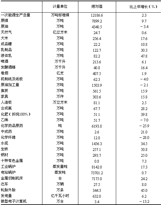 工業(yè)產(chǎn)銷水平進(jìn)一步提高。全年規(guī)模以上工業(yè)產(chǎn)銷率為98.2%,比上年提高1.1個(gè)百分點(diǎn);工業(yè)品出口交貨值104.1億元,增長(zhǎng)24.3%。在234種工業(yè)產(chǎn)品中,產(chǎn)量比上年增長(zhǎng)或持平的有162種,占69.2%,其中有53種產(chǎn)品產(chǎn)量增幅超過30%。規(guī)模以上工業(yè)企業(yè)主要工業(yè)產(chǎn)品產(chǎn)量如下: