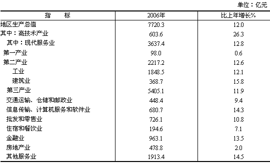 初步核算,全市實(shí)現(xiàn)地區(qū)生產(chǎn)總值7720.3億元,比上年增長(zhǎng)12%,連續(xù)第8年實(shí)現(xiàn)兩位數(shù)增長(zhǎng)。其中,第一產(chǎn)業(yè)增加值98億元,增長(zhǎng)0.6%;第二產(chǎn)業(yè)增加值2217.2億元,增長(zhǎng)12.6%;第三產(chǎn)業(yè)增加值5405.1億元,增長(zhǎng)11.9%,占地區(qū)生產(chǎn)總值的比重達(dá)到70%。按常住人口計(jì)算,當(dāng)年人均GDP達(dá)到49505元(折合6210美元),比上年增長(zhǎng)8.8%。三次產(chǎn)業(yè)結(jié)構(gòu)由上年的1.4:29.5:69.1變化為1.3:28.7:70。 全市現(xiàn)代服務(wù)業(yè)實(shí)現(xiàn)增加值3637.4