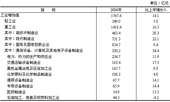 工業(yè):全市完成工業(yè)增加值1848.5億元,比上年增長(zhǎng)12.1%。其中規(guī)模以上工業(yè)企業(yè)完成增加值1767.4億元,增長(zhǎng)14.1%。在規(guī)模以上工業(yè)企業(yè)中,高技術(shù)制造業(yè)、現(xiàn)代制造業(yè)分別完成增加值463.4億元和731.3億元,分別增長(zhǎng)28.3%和22.1%,占規(guī)模以上工業(yè)增加值的比重分別為26.2%和41.4%(二者有交叉部分)。通信設(shè)備、計(jì)算機(jī)及其他電子設(shè)備制造業(yè)完成增加值330.2億元,增長(zhǎng)34.4%;交通運(yùn)輸設(shè)備制造業(yè)完成增加值163.4億元,增長(zhǎng)17.3%。產(chǎn)銷(xiāo)銜接良好,產(chǎn)品銷(xiāo)售率為98.7%,比上年提高0.4個(gè)百分點(diǎn)。