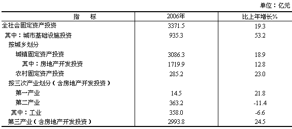 在全社會(huì)固定資產(chǎn)投資中,第一產(chǎn)業(yè)投資增長(zhǎng)21.8%,增幅低于上年61.3個(gè)百分點(diǎn);第二產(chǎn)業(yè)投資由上年的增長(zhǎng)21.8%轉(zhuǎn)為下降11.4%,其中工業(yè)投資由增長(zhǎng)19.1%轉(zhuǎn)為下降6.6%;第三產(chǎn)業(yè)投資增長(zhǎng)24.5%,增幅提高0.8個(gè)百分點(diǎn),占全社會(huì)固定資產(chǎn)投資的比重為88.8%,比上年提高3.7個(gè)百分點(diǎn)。 全市完成基礎(chǔ)設(shè)施投資935.3億元,比上年增長(zhǎng)53.2%,增幅比上年提高21.4個(gè)百分點(diǎn);占全社會(huì)固定資產(chǎn)投資的比重為27.7%,比上年提高6.1個(gè)百分點(diǎn)。其中,交通運(yùn)輸、公共服務(wù)業(yè)分別完成投資439.6億元和265.3億元,分別增長(zhǎng)96.2%和65.4%。 房地產(chǎn)開(kāi)發(fā):全市商品房施工面積10483.5萬(wàn)平方米,比上年下降2.5%;其中商品住宅6311.3萬(wàn)平方米,下降13.3%。商品房竣工面積3193.9萬(wàn)平方米,下降15.3%;其中商品住宅2193.3萬(wàn)平方米,下降22.8%。全市商品房銷(xiāo)售面積(含現(xiàn)房和期房)2607.6萬(wàn)平方米,其中商品住宅2205萬(wàn)平方米;商品房銷(xiāo)售額(含現(xiàn)房和期房)2159億元,其中商品住宅1626.3億元。商品房空置面積1039.7萬(wàn)平方米,比上年末減少334.5萬(wàn)平方米;其中商品住宅空置494.1萬(wàn)平方米,減少305.6萬(wàn)平方米。