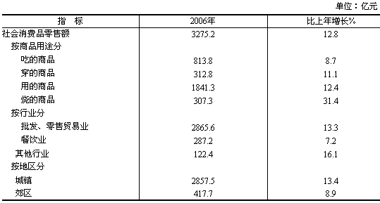 國(guó)內(nèi)貿(mào)易:全市實(shí)現(xiàn)社會(huì)消費(fèi)品零售額3275.2億元,比上年增長(zhǎng)12.8%,扣除物價(jià)上漲因素,實(shí)際增長(zhǎng)12.6%。在限額以上批發(fā)零售企業(yè)零售額中,通訊器材類(lèi)增長(zhǎng)21.2%,家用電器和音像器材類(lèi)增長(zhǎng)11.9%,家具類(lèi)增長(zhǎng)26.4%,汽車(chē)類(lèi)增長(zhǎng)17.3%,石油及制品類(lèi)增長(zhǎng)35.1%。