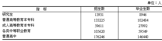 全年研究生教育招生1.4萬人,在學(xué)研究生4.1萬人,畢業(yè)生8946人。普通高等教育招生13.3萬人,在校生43.5萬人,畢業(yè)生10.2萬人。成人高等教育招生6.0萬人,在校生16.5萬人,畢業(yè)生2.8萬人。各類中等職業(yè)教育招生10.6萬人,在校生22.9萬人,畢業(yè)生6.0萬人。普通高中招生17.6萬人,在校生51.3萬人,畢業(yè)生14.6萬人。初中招生31.8萬人,在校生100.6萬人,畢業(yè)生38.8萬人。小學(xué)招生23.6萬人,在校生155.6萬人,畢業(yè)生31.2萬人。幼兒園在園幼兒32.5萬人。特殊教育招生428人,在校生4881人,畢業(yè)生611人。