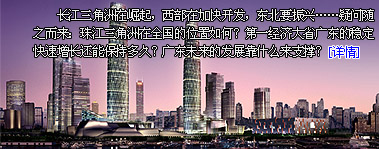 | 出于拓展腹地的迫切需要,廣東于2004年倡導(dǎo)并發(fā)起了構(gòu)建泛珠三角區(qū)域合作的攻略。幾年來,由珠江流域11個(gè)省區(qū)聯(lián)手策動(dòng)的泛珠合作,已成為實(shí)現(xiàn)合作各方共同利益、促進(jìn)港澳繁榮穩(wěn)定、推動(dòng)?xùn)|中西部協(xié)調(diào)發(fā)展的重要載體和戰(zhàn)略平臺(tái),對國內(nèi)外區(qū)域競爭和發(fā)展大局產(chǎn)生重大而積極的影響。[詳情] | |