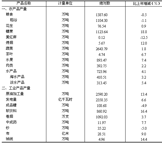 全年糧食作物播種面積2767.10千公頃,比上年下降0.7%。糖蔗種植面積142.69千公頃,增長13.8%;油料種植面積316.02千公頃,下降0.6%;蔬菜種植面積1185.16千公頃,增長1.9%。 全年糧食產(chǎn)量1387.60萬噸,下降0.5%。糖蔗產(chǎn)量1123.64萬噸,增長18.8%。油料產(chǎn)量77.57萬噸,增長0.7%。蔬菜產(chǎn)量2643.79萬噸,增長1.8%。水果產(chǎn)量893.47萬噸,增長7.4%。茶葉產(chǎn)量4.74萬噸,增長6.7%。 全年肉類總產(chǎn)量392.75萬噸,增長2.2%。其中豬肉產(chǎn)量259.53萬噸,增長1.3%;禽肉產(chǎn)量118.78萬噸,增長4.5%。全年水產(chǎn)品產(chǎn)量723.96萬噸,增長4.1%。其中海水產(chǎn)品產(chǎn)量410.51萬噸,淡水產(chǎn)品產(chǎn)量313.45萬噸,分別增長3.2%和5.4%。