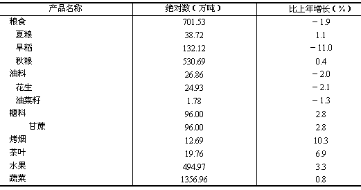 全省農(nóng)林牧漁業(yè)完成總產(chǎn)值1473.41億元,比上年增長3.0%,增幅比上年回落1.7個百分點(diǎn)。 糧食種植面積2093.76萬畝,比上年減少68.18萬畝;煙葉種植面積103.69萬畝,增加3.52萬畝;蔬菜種植面積956.67萬畝,增加8.59萬畝;花卉種植面積15.86萬畝,增加0.74萬畝;油料種植面積182.21萬畝,減少1.38萬畝。糧食產(chǎn)量701.53萬噸,比上年減產(chǎn)1.9%;煙葉產(chǎn)量12.84萬噸,增產(chǎn)10.1%;油料產(chǎn)量26.86萬噸,減產(chǎn)2.0%;蔬菜產(chǎn)量1356.96萬噸,增產(chǎn)0.8%,水果產(chǎn)量494.97萬噸,增產(chǎn)3.3%(見表2)。