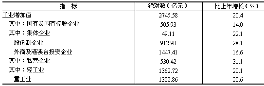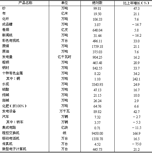 發(fā)電量904.25億千瓦小時,增長16.2%;原煤1759.18萬噸,增長21.1%。 黑色金屬冶煉及壓延加工業(yè)總產(chǎn)值比上年增長32.9%,非金屬礦物制品工業(yè)增長28.6%,化學(xué)原料及化學(xué)制品制造業(yè)增長13.5%,有色金屬冶煉及壓延加工業(yè)增長31.1%。主要原材料產(chǎn)品中,鋼材842.55萬噸,增長33.7%;粗鋼產(chǎn)量465.48萬噸,增長20.9%;水泥3343.93萬噸,增長24.9%;十種有色金屬增長34.2%,硫酸、純堿、燒堿等主要化工產(chǎn)品增長2.9%至16.7%。 通用設(shè)備制造業(yè)總產(chǎn)值比上年增長27.6%,電氣機(jī)械及器材制造業(yè)增長16.0%,交通運(yùn)輸設(shè)備制造業(yè)增長24.8%。發(fā)電設(shè)備增長42.7%;汽車產(chǎn)量7.32萬輛,下降2.7%,其中轎車3.57萬輛,下降5.3%。 高技術(shù)產(chǎn)業(yè)總產(chǎn)值比上年增長26.4%。在高技術(shù)產(chǎn)業(yè)中,通信設(shè)備、計算機(jī)及其他電子設(shè)備制造業(yè)增長29.6%,其中彩色電視機(jī)、程控交換機(jī)、移動電話機(jī)、微型電子計算機(jī)等產(chǎn)品產(chǎn)量分別增長16.5%至166.9%(工業(yè)主要產(chǎn)品產(chǎn)量見表4)。