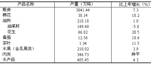 農(nóng)業(yè)穩(wěn)定發(fā)展。認真落實一系列支農(nóng)惠農(nóng)政策,加上有利的氣候條件,糧食增產(chǎn)、農(nóng)業(yè)增效、農(nóng)民增收保持良好勢頭。全年糧食總產(chǎn)量達3041.44萬噸,比上年增加206.85萬噸,增長7.3%。其中夏糧總產(chǎn)量939.14萬噸,比上年增長11.2%;秋糧總產(chǎn)量2102.30萬噸,增長5.6%。種植業(yè)結(jié)構(gòu)發(fā)生變化,全年糧食種植面積為498.51萬公頃,比上年增加7.56萬公頃;棉花、油料種植面積分別為35.49萬公頃、81.23萬公頃,分別減少1.34萬公頃和3.46萬公頃。蔬菜面積117.36萬公頃,下降1.7%。優(yōu)質(zhì)、高效、安全和生態(tài)農(nóng)業(yè)發(fā)展較快。 林牧漁業(yè)生產(chǎn)穩(wěn)定。全年造林面積6.65萬公頃。多數(shù)畜產(chǎn)品產(chǎn)量持平,肉類總產(chǎn)量346.73萬噸,與上年持平,其中豬牛羊肉產(chǎn)量242.10萬噸,禽肉產(chǎn)量103.71萬噸;禽蛋總產(chǎn)量185.54萬噸,增長1.9%;牛奶總產(chǎn)量60.81萬噸,增長7.4%。全年水產(chǎn)品總產(chǎn)量405.45萬噸,增長4.3%;其中淡水產(chǎn)品286.37萬噸,海水產(chǎn)品119.08萬噸,分別增長4.1%和5.0%。