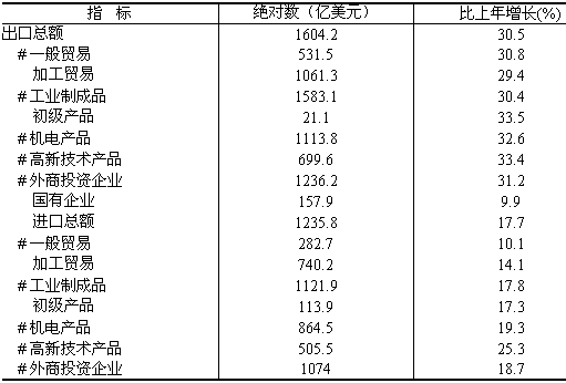 對外貿(mào)易平穩(wěn)較快增長。全年進出口總額2840.0億美元,比上年增長24.6%。其中,出口總額1604.2億美元,增長30.5%;進口總額1235.8億美元,增長17.7%。出口商品結(jié)構(gòu)不斷優(yōu)化。機電產(chǎn)品、高新技術(shù)產(chǎn)品出口額占出口總額的比重分別為69.4%和43.6%。其中計算機與通信技術(shù)出口568.7億美元,占高新技術(shù)產(chǎn)品出口額的81.3%,增長31.0%。農(nóng)產(chǎn)品出口額12.2億美元,增長33.1%。外商投資企業(yè)出口占出口總額的比重為77.1%。私營企業(yè)出口較快增長,出口額為165.3億美元,增長63.2%。對歐盟、美國、日本、香港特別行政區(qū)的出口分別為381.2億美元、363.8億美元、180.6億美元和155.7億美元,增長32.5%、33.5%、12.9%和14.5%;從東盟、韓國、臺灣省進口額171.8億美元、223.5億美元和249.8億美元,增長29.2%、3.0%和18.2%;對俄羅斯、拉丁美洲、非洲出口額11.4億美元、53.4億美元和26.9億美元,分別增長49.4%、62.7%和47.6%。