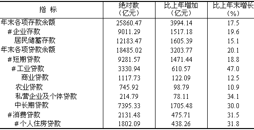 財政支出結(jié)構(gòu)繼續(xù)調(diào)整。一般預算支出1987.59億元,增支314.19億元,可比增長15.2%;基金預算支出705.52億元,增支162.70億元,增長30.0%。全年農(nóng)林水氣象支出119億元,增長22.0%;社會保障補助支出80.84億元,增長26.9%;醫(yī)療衛(wèi)生支出88.74億元,教育支出297.96億元,科學支出10.56億元,分別增長18.2%、17.2%和32.8%;基本建設(shè)撥款184.09億元,企業(yè)挖潛改造資金71.65億元,行政管理費229.37億元,分別增長19.8%、13.1%和17.7%。 金融運行平穩(wěn)。年末廣義貨幣供應(yīng)量(M2)余額、狹義貨幣供應(yīng)量(M1)余額和流通中現(xiàn)金(M0)余額為29024.09億元、11018.20億元和3501.85億元,分別比上年增長17.8%、21.7%和15.4%。年末全省金融機構(gòu)人民幣貸款余額18485.02億元,比年初增加3203.77億元,同比多增1062.26億元;其中短期貸款增加1471.44億元,同比多增785.16億元。年末全省金融機構(gòu)人民幣存款余額25860.47億元,比年初增加3994.14億元,同比多增375.46億元;其中,居民儲蓄存款增加1605.39億元,同比少增112.51億元;企業(yè)存款增加1517.18億元,同比多增739.88億元。