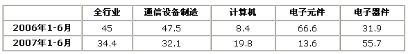圖1 2007年1-6月電子信息產(chǎn)業(yè)與全國制造業(yè)累計(jì)完成投資增速對比情況(%)