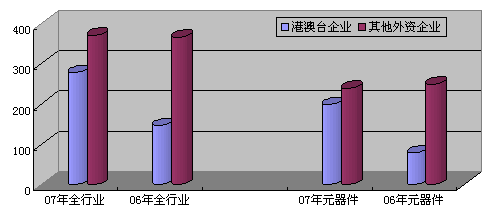 2006-2007年上半年全行業(yè)及電子元器件行業(yè)內(nèi)港澳臺和其他外商投資企業(yè)投資變化情況