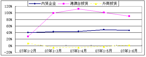 5、外商投資增長由負(fù)轉(zhuǎn)正,港澳臺企業(yè)投資高漲,私營企業(yè)投資保持活躍 隨著我國對高耗能、高污染投資項(xiàng)目的限制,企業(yè)所得稅內(nèi)外合一實(shí)施日期的臨近,再加上其他發(fā)展中國家如印度、越南等對引入外資的競爭,今年前5個(gè)月我國電子信息產(chǎn)業(yè)外資企業(yè)(港澳臺企業(yè)除外)的投資一直處于負(fù)增長狀態(tài),進(jìn)入6月份后,外資企業(yè)投資開始有所增長,累計(jì)完成投資371.2億元,同比增長1.3%。其中,移動通信及終端設(shè)備、計(jì)算機(jī)整機(jī)、集成電路、電子元件及組件幾個(gè)行業(yè)的外商投資仍處于負(fù)增長狀態(tài),移動通信及終端設(shè)備行業(yè)降幅高達(dá)54%。 港澳臺企業(yè)投資增速今年以來一直保持迅猛增長,1-6月累計(jì)完成投資279.1億元,同比增長89.7%,增幅比去年同期高78個(gè)百分點(diǎn)。港澳臺企業(yè)的投資主要集中在移動通信及終端設(shè)備、集成電路及光電子器件行業(yè)。 港澳臺企業(yè)與外商投資的不同發(fā)展趨勢,引起了我國電子信息產(chǎn)業(yè)投資結(jié)構(gòu)的變化。1-6月三資企業(yè)在我國大陸的總投資中,