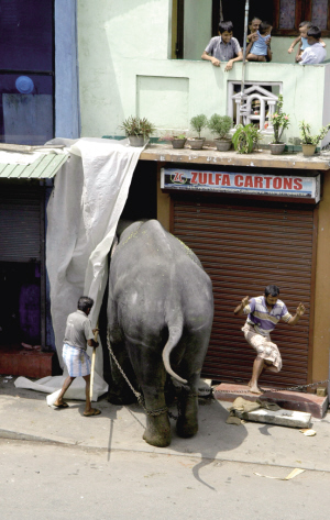 7月30日,在斯里蘭卡首都科倫坡的一個(gè)節(jié)日慶典上,看象人正試圖阻止一頭想要“入侵”建筑物的大象。這頭15歲的大象在節(jié)日慶典上突然“情緒失控”,毀壞了兩輛三輪出租車(chē),并一度造成交通堵塞。