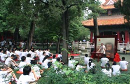 圖為曲阜師范大學(xué)駱承烈教授在孔廟杏壇講授儒學(xué)文化,吸引了眾多中學(xué)生和游客前來(lái)聽(tīng)課。新華社記者:何柳 攝