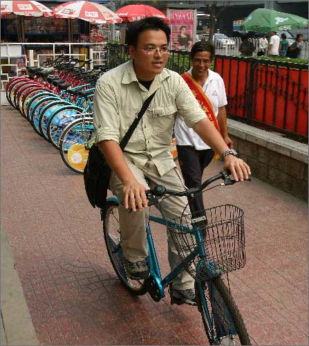 8月20日,一名記者在租車點(diǎn)采訪時(shí)試騎出租的自行車。新華社發(fā)(卓恩森 攝) |