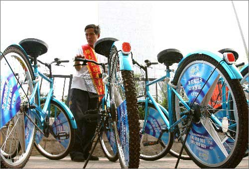 8月20日,在北京地鐵大望路租車點(diǎn),一名工作人員在整理出租的自行車。為了進(jìn)一步減少汽車尾氣對(duì)大氣的污染,北京市提倡市民騎自行車出行,啟動(dòng)了公共單車推廣活動(dòng)。目前已在城區(qū)數(shù)十個(gè)自行車出租點(diǎn)投放了5000輛自行車。奧運(yùn)會(huì)前,自行車出租點(diǎn)將增至200個(gè),將有5萬(wàn)輛自行車供出租。