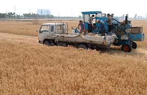 鄭州郊區(qū)農(nóng)民收打小麥。攝影/本報(bào)記者