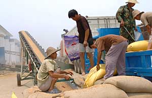 | 中央儲(chǔ)備糧河南漯河直屬庫(kù)工作人員將新收購(gòu)的小麥除雜入庫(kù)。攝影/本報(bào)記者